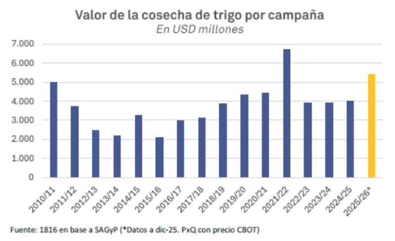 Medido en dólares, el valor de la cosecha de la campaña de trigo de 2025 superaría los u$s 5000 millones, siendo el nivel más elevado desde la campaña de 2021 y 2022.