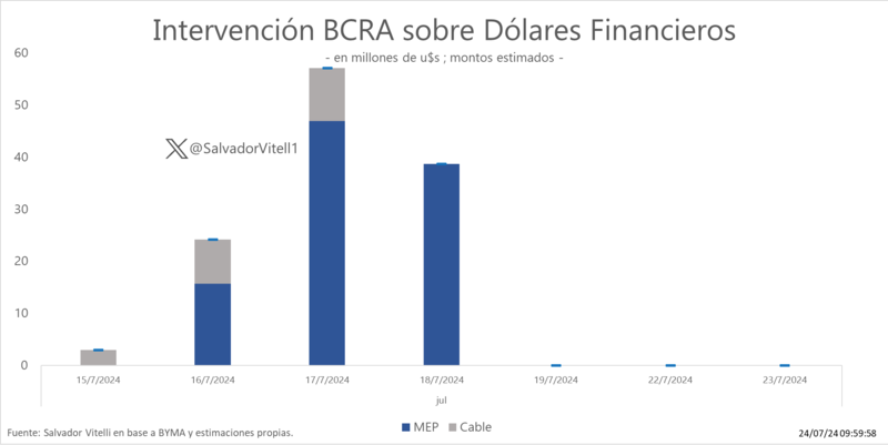 De acuerdo con Siaba, en base a los datos del BCRA, en la primera rueda posterior al anuncio del nuevo esquema fue de apenas u$s 7 millones. En la rueda siguiente, cuando el volumen operado en los bonos AL30 y GD30 en las especies "C" y "D" saltó de u$s 61,2 millones a u$s 93,6 millones, la intervención repuntó a u$s 21,3 millones.