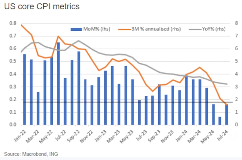 Los analistas del banco ING agregaron que los datos de inflación de julio sugieren que la Reserva Federal sigue en camino de alcanzar su objetivo del 2%, lo que debería permitirle centrarse cada vez más en su otro objetivo, que es maximizar el empleo en Estados Unidos.