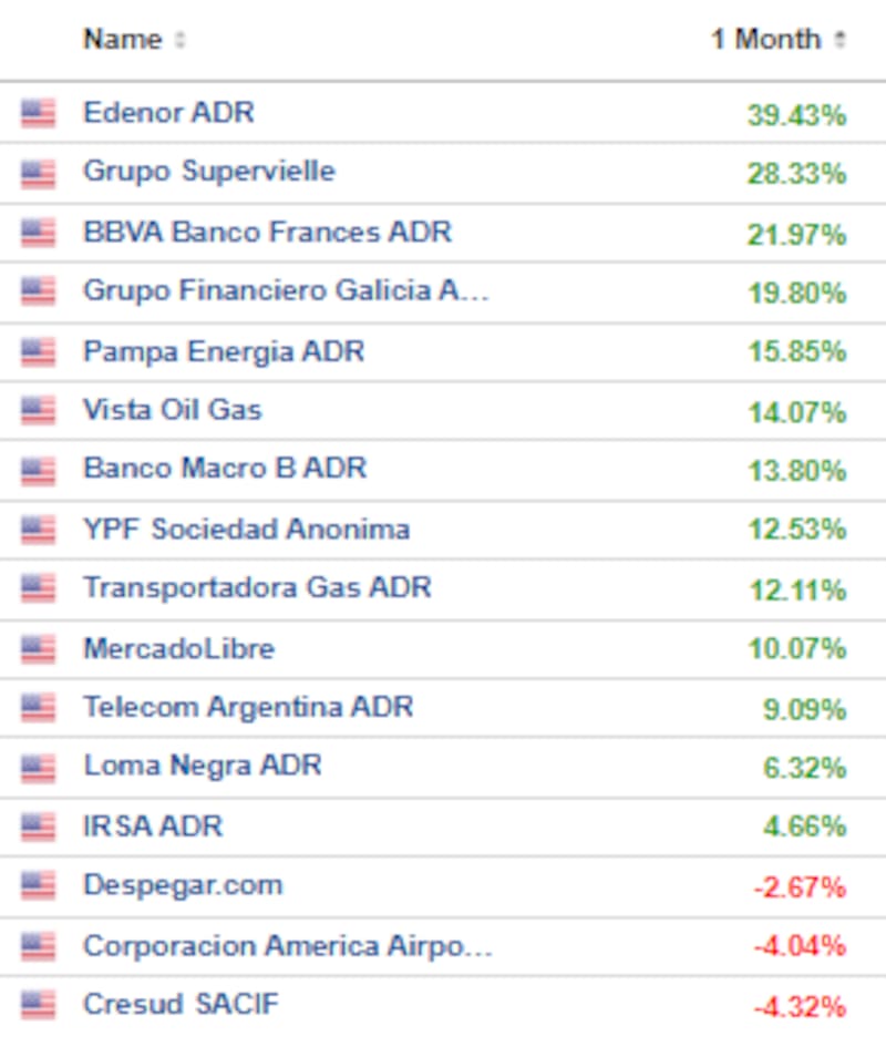Salvo Cresud, Corporación América y Despegar, que caen entre 2,7% y 4,3%, el resto de las acciones muestra ganancias en el último mes desde 4,7% en adelante. En ese período, Edenor lidera las ganancias, subiendo un 39%, seguida por el Grupo Supervielle, BBVA Argentina y Grupo Financiero Galicia, que ganan 28%, 22% y 20% respectivamente.