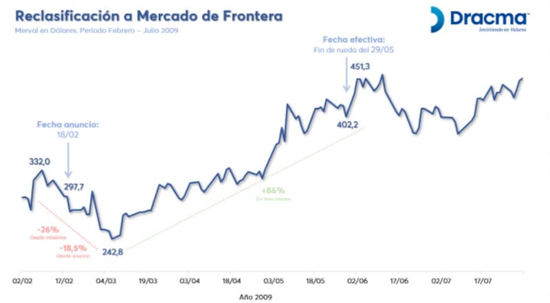 "Cuando el 18 de febrero de 2009 se anuncia que Argentina iba a ser reclasificada a Frontera, vimos una corrección importante de la suba que venía trayendo el mercado hasta entonces. Entre febrero y marzo de 2009, el Merval cayó un 32% en dólares. Desde allí arrancó una recuperación hasta finales de mayo de 2009 cuando el índice Merval se duplicó en monda dura. Esto puede servir como referencia de lo que podríamos encontrarnos", dijo la analista de Dracma.