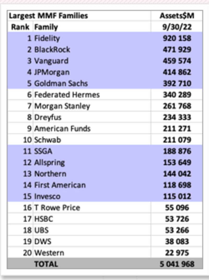 Si bien es un mercado muy competitivo, los grandes jugadores de la industria son Fidelity (administra el 18% del total dentro de la industria de money market), Vanguard (9%), Blackrock (9%), JP Morgan (8%) y Goldman Sachs (7%).