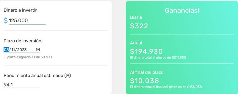 Esta billetera virtual ofrece un 99,39% de Tasa Nominal Anual (un 8,28% por mes). Este porcentaje permitirá obtener intereses de $ 10.350 a los 30 días, lo que equivale a un capital total de $ 135.350.
