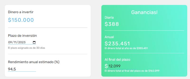 Para el caso de esta apps financiera, la tasa anual es del 99,6% por lo que obtendrías una ganancia de $ 12.450, con una tasa mensual del 8,3%.