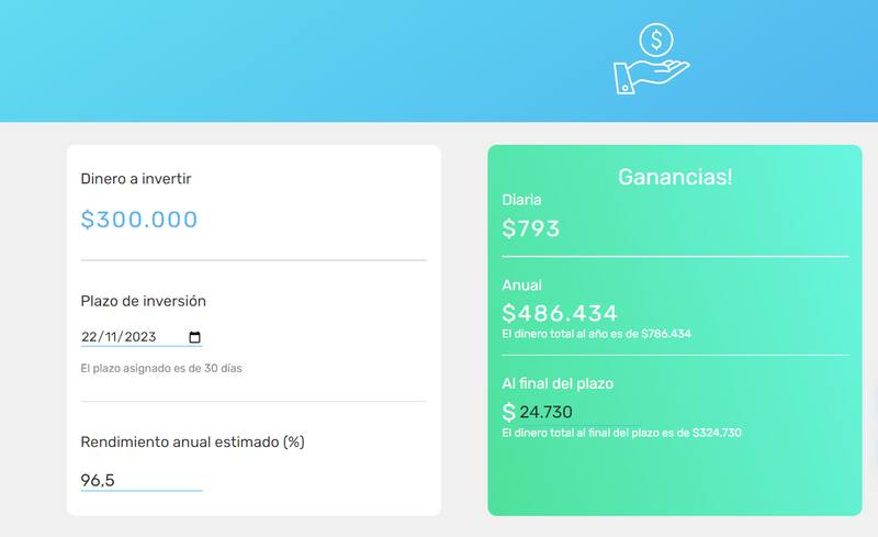 Entonces, si invertís en $ 300.000 en un plazo de 30 días, obtendrás una ganancia de $ 27.480 teniendo un rendimiento mensual del 9,16%.
