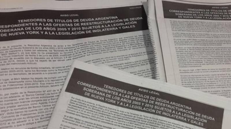 Hoy el Gobierno argentino publicó un aviso legal dirigido a los tenedores de títulos de deuda argentina correspondientes a las ofertas de reestructuración de deuda soberana de los años 2005 y 2010 sujetos a la legislación de Nueva York y a la legislación de Inglaterra y Gales en el que les informó que los montos correspondientes a los Bonos Par equivalentes a u$s 161 millones fueron depositados.