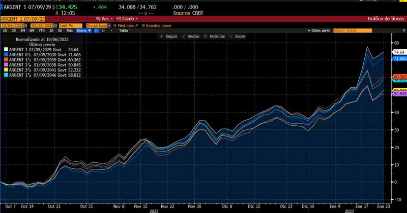 En el tramo medio, la deuda a 2035 y 2038 ganan 60% y 51% respectivamente, mientras que, en el extremo más largo, los bonos suben 52% y 59% en los Globales a 2041 y 2046.