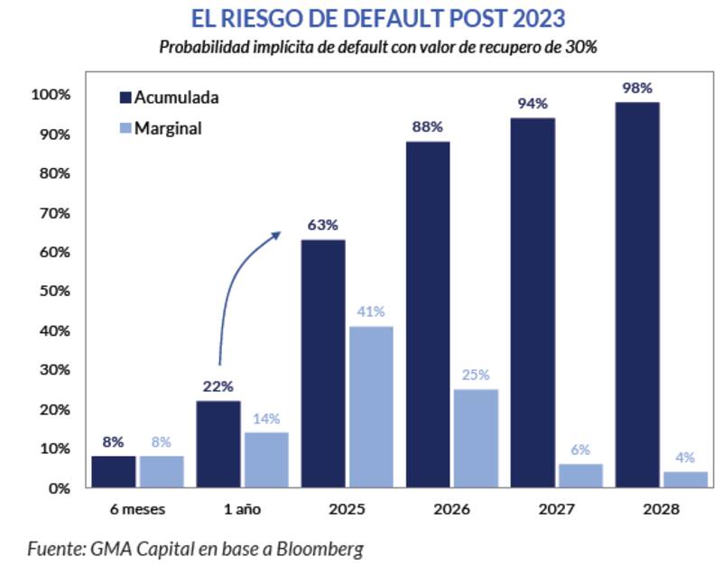 Además, y mirando a los años subsiguientes, la probabilidad de default salta al 88% en 2026, 94% en 2027 y 98% en 2028.