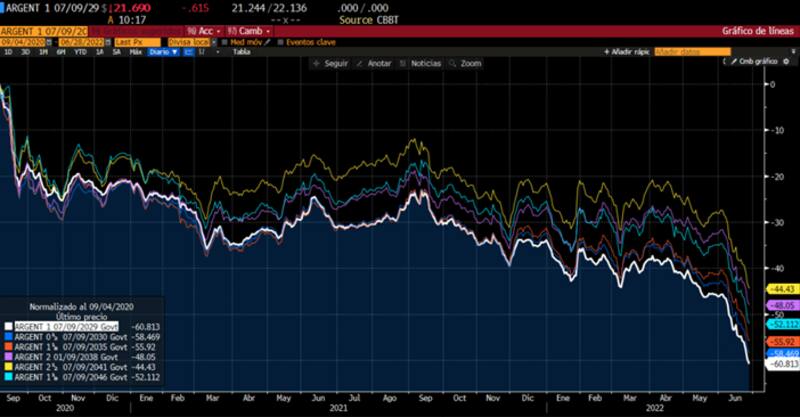 Hoy los bonos tienen paridades debajo del 25% en todos los tramos de la curva y se ubican en mínimos incluso debajo de los valores alcanzados en el peor momento de la pandemia y se encuentra en niveles similares a los del 2008 o en 2001.