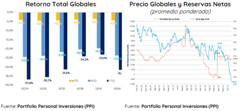 "Los precios siguieren que los inversores descuentan un incumplimiento próximo, prolongado y seguido de una dura reestructuración. Las reservas netas alcanzan para efectuar el pago del 11 de julio (u$s 700millones entre Globales y Bonares), aunque las valuaciones sugieren que se teme un incumplimiento", dijo Yarde Buller.