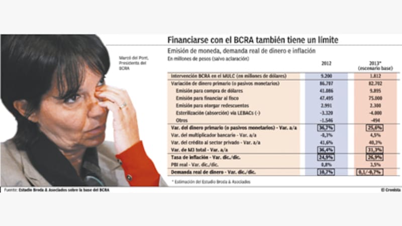Entiende que el gobierno ya está en una situación delicada: en 2012, con once puntos más de emisión de dinero primario que el previsto en 2013 (36,7% versus 25,6%), la inflación fue dos puntos menor (24,9% versus 27%). Porque la demanda real de dinero aumentó 10,7% el año pasado por la imposición del cepo cambiario y este año dejó de crecer la sociedad no estuvo dispuesta a quedarse con los pesos adicionales emitidos para financiar al fisco.