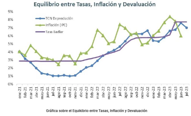 "En junio se observó una inflación del 6% con una tasa de política monetaria del 8,08%. Consideramos adecuada la decisión del BCRA, porque el objetivo de la tasa de interés es mantener contenida la demanda de divisas y el impacto que eso puede generar sobre la brecha cambiaria. A menos de 30 días de las Elecciones Primarias (PASO), nos parece razonable que mantenga esa política y evite cualquier shock sobre el mercado cambiario", afirmó.
