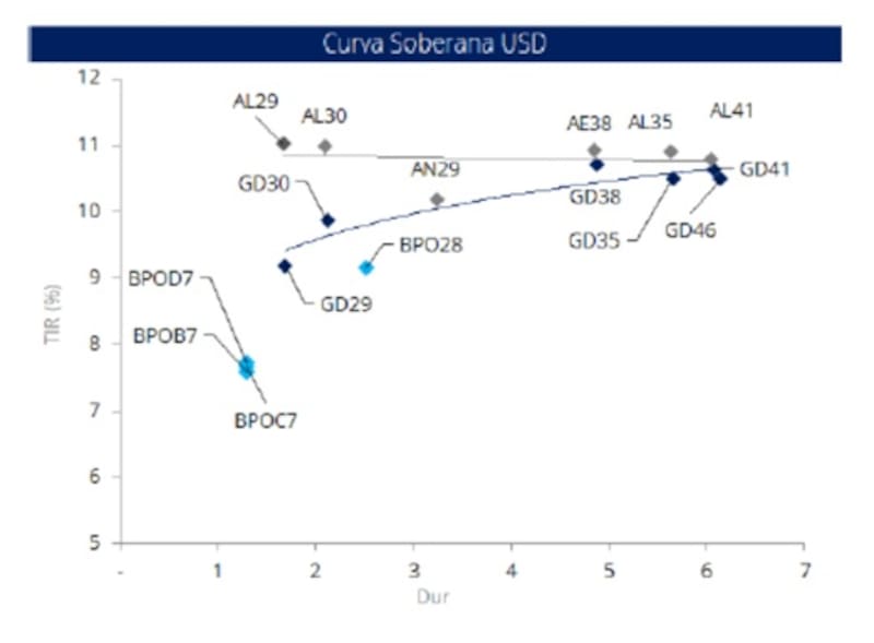 En relación al potencial alcista, desde Research Mariva estimaron que, en un escenario de tres meses en el que la curva soberana se normaliza a una calificación crediticia B- con rendimientos cercanos al 8%, los bonos GD35 y GD41 ofrecen el mayor potencial alcista, en torno al 11%.