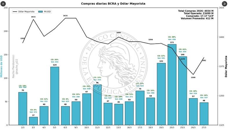 Lleva 56 ruedas de compras consecutivas, acumulando en marzo u$s 1322 millones y más de u$s 4000 millones en 2026, todo ello antes de la liquidación gruesa del agro.