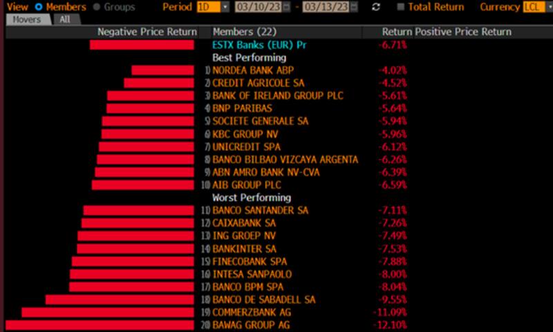Las acciones bancarias en Wall Street y en Europa se amplían, con pérdidas de hasta 12% el lunes.