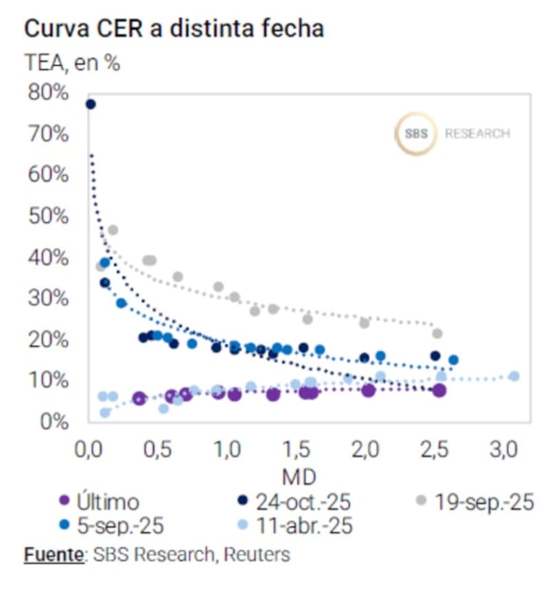 La mejora también se evidenció en la curva CER, la cual llegó a operar con tasas reales del 50% y curva invertida, mientras que hoy toda la curva de tasa real se ubica debajo del 10% y con pendiente positiva.