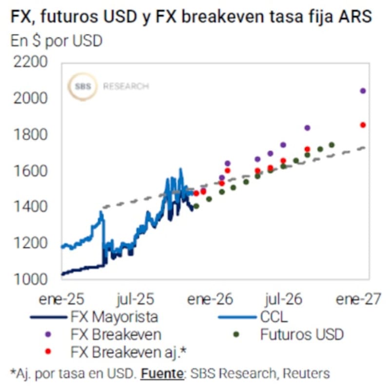 “Posiblemente el objetivo sea el de seguir bajando las tasas más largas y de esa manera alinear expectativas de tipo de cambio y de inflación hacia niveles más bajos. Posiblemente esto incida sobre el precio de los futuros y sobre el punto de equilibrio de los tipos de cambio implícitos que venían operando por arriba del techo de la banda desde mayo 2026 en adelante”, dijo Benítez.