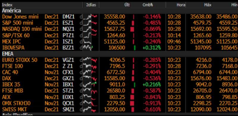 La bolsa de Italia es la que más cae, perdiendo 0,58%, seguida por el DAX30 de Alemania, que retrocede 0,53%.