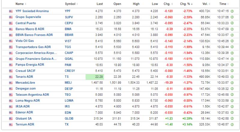 MercadoLibre cae 1,2% y solamente Ternium y Globant suben 3,1% y 0,4% respectivamente.