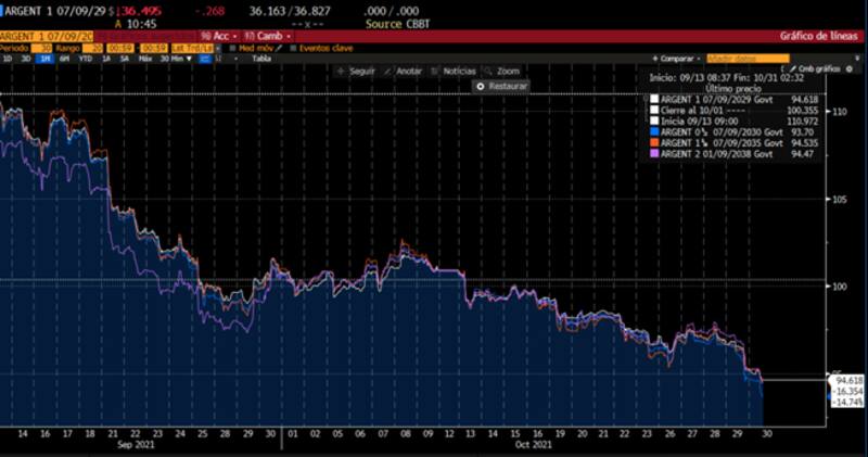 Desde el resultado posterior a las PASO hasta la actualidad, los bonos caen cerca de un 15% y operan un 10% debajo de los valores previos a las elecciones primarias de septiembre pasado.
