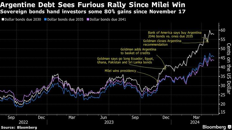 "La cantidad de malas noticias que se descuentan ha disminuido drásticamente", dijo Alejo Czerwonko, director de inversiones para EM Americas en Gestión Patrimonial Global de la UBS. "Si vemos que se cumple la agenda de política interna y el mercado llega a un acuerdo sin reestructuración bajo Milei, entonces se pueden ver más ventajas".