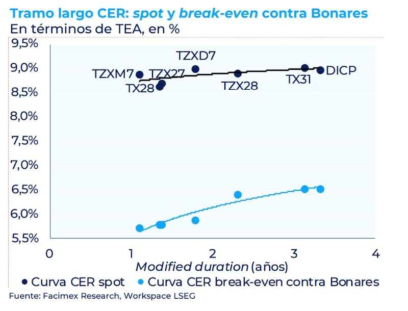 “Para una modified duration benchmark de 2 años, como la del Boncer de diciembre de 2027 (TZXD7) o la del Boncer de junio de 2028 (TZX28), la curva CER opera con rendimientos del 8,69% que se ubican 13pbs por encima de los observa-dos en la curva de Bonares (MEP) para igual modified duration”, remarcaron.