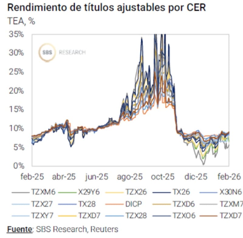 “Reforzamos el posicionamiento en bonos CER, con foco en el tramo medio de la curva. El TZX26 (CER +8%) y el TZXD6 (CER +8,6%) resultan atractivos al descontar una inflación implícita promedio del 1,8% m/m entre febrero y abril y del 1,6% m/m entre mayo y octubre de 2026”, sostuvieron desde Cohen.
