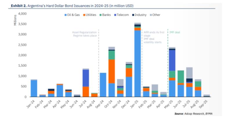 Desde Adcap Grupo Financiero señalaron al respecto que, el total de emisiones corporativas en todos los sectores alcanzó los u$s 21.000 millones, de los cuales u$s 10.100 millones corresponden a 2024 y u$s 10.900 millones al período transcurrido de 2025.