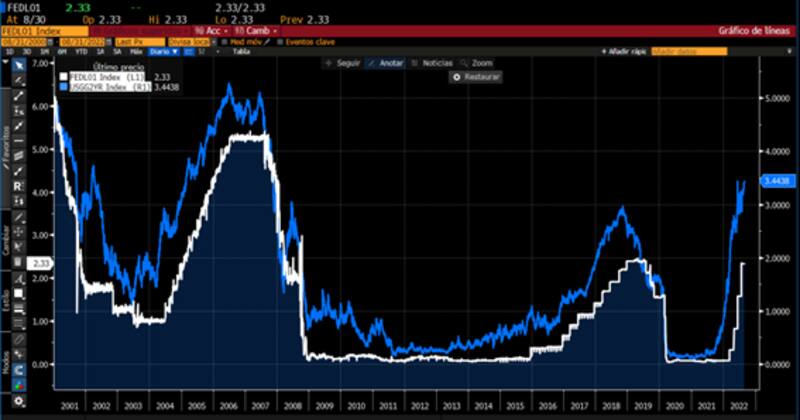 La Fed ya lleva dos reuniones consecutivas de subas de 75 puntos básicos, lo cual demuestra una agresividad en la suba de tasas no vista desde la época de los años 70´ y 80´.