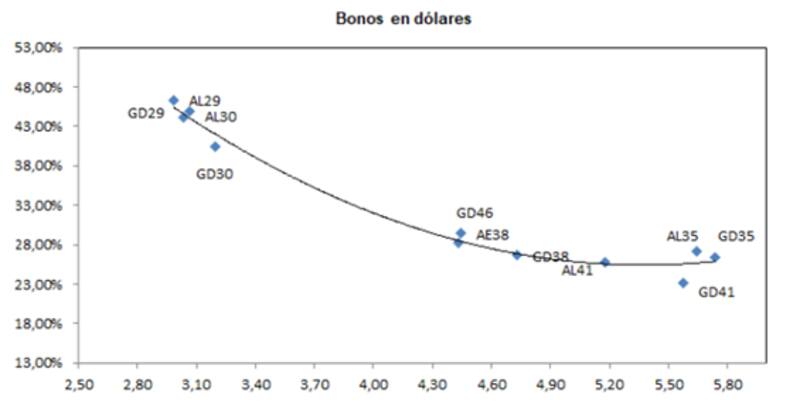 Hoy los bonos más cortos de argentina son a 2029 y rinden cerca del 48%, con una duration cercana a 3 años, mientras que la deuda más larga rinde en torno al 28%, con duration cercana a 6.