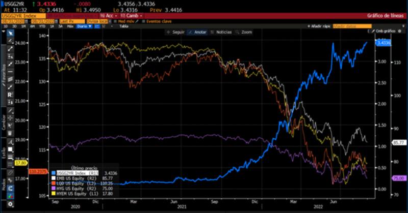 Por lo tanto, el mercado especula con que la Fed subirá la tasa en 75 puntos básicos en la reunión de septiembre y espera que las tasas de interés seguirán altas por más tiempo, lo cual provocó un rally en los rendimientos de los bonos del tesoro americano.