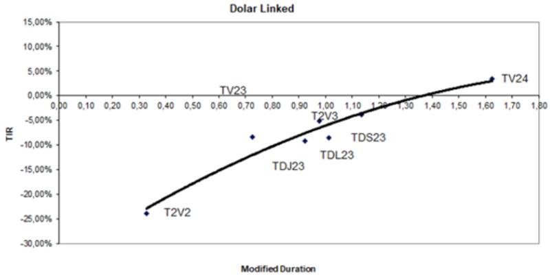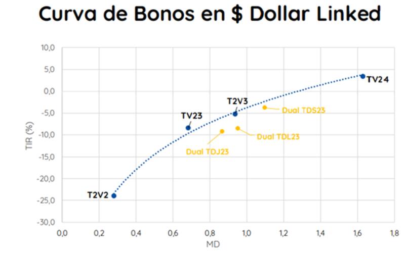 La curva dólar linked muestra retornos en el tramo más corto en niveles de -25%, saltando a la zona de entre -10% y -5% para los plazos a 2023 y salta a 3% para el TV24.