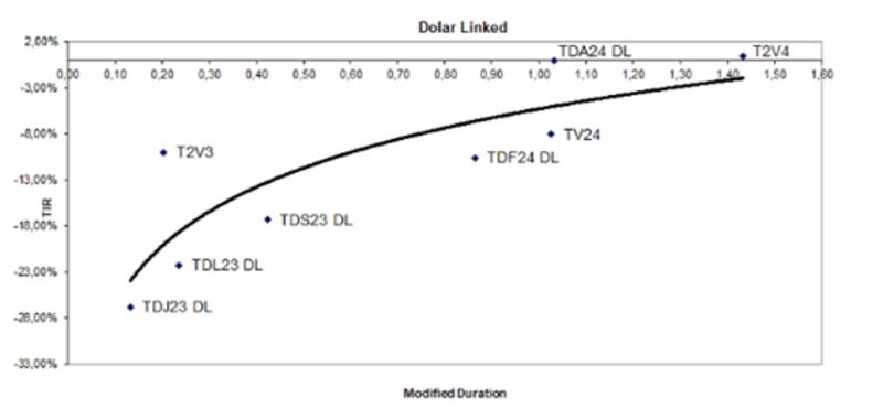 Por otro lado, la curva dólar linked muestra rendimientos negativos extremos. Los duales valuados como instrumento de cobertura cambiaria operan con tasas negativas de entre -28% y -12%. Los bono dólar linked operan con rendimientos negativos menores al -6%.