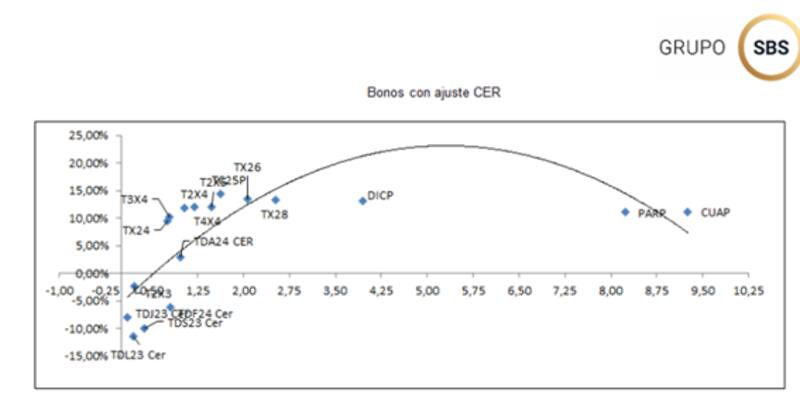 Los bonos que ajustan por CER operan con tasas muy negativas en el tramo corto. Las mismas llegan a los dos dígitos negativos en los vencimientos más cortos, mientras que saltan a operar con tasas de 10% en los vencimientos de 2024 en adelante.