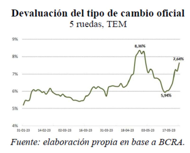 Luego, llevó al ritmo cambiario a niveles de 5,94% y finalmente, en las últimas semanas, volvió a acelerar el crawling peg para alcanzar el 7,64% mensual actual.