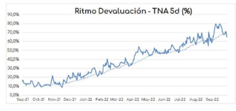 El ritmo de devaluación cayó debajo del 70% de TNA promedio en los últimos 5 días por primera vez en 15 días.