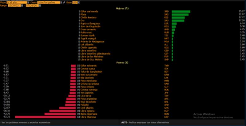 Le siguieron la lira turca (+7,75%) y el peso mexicano (+3,1%). En cambio, las más devaluadas fueron el yen japonés (-9,22%), el franco suizo (-7,57%) y el baht tailandés (-6,87%).