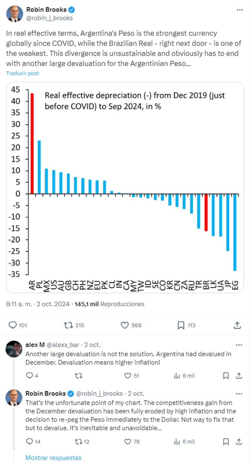 "En términos reales, el peso argentino es la moneda más fuerte del mundo desde la pandemia, mientras que el real brasileño, que está justo al lado, es una de las más débiles. Esta divergencia es insostenible y, obviamente, tiene que terminar con otra gran devaluación del peso argentino...", postuló Brooks.