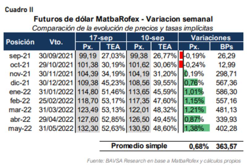 "Si bien todavía no hay datos oficiales, observando la pantalla de operaciones creemos que desde el miércoles pasado, el BCRA intervino en el mercado de futuros, vendiendo contratos. Esta observación la sumamos al fuerte incremento del interés abierto en contratos de dólar Rofex que ocurrió en la semana, y en el que se pasó de u$s 2940 millones del martes de la semana pasada a u$s 3286 millones al viernes pasado, un incremento de u$s 346 millones en sólo tres ruedas. Otro elemento que nos lleva a pensar que el BCRA está participando fuertemente en el mercado de futuros", dijeron desde BAVSA.