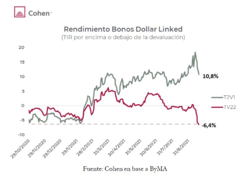 Tal es la búsqueda de cobertura a través de los bonos dólar linked, que los rendimientos del TV22 (dólar linked a 2022), operaron con su tasa más negativa desde que fueron emitidos en octubre de 2020, en -6,4%.