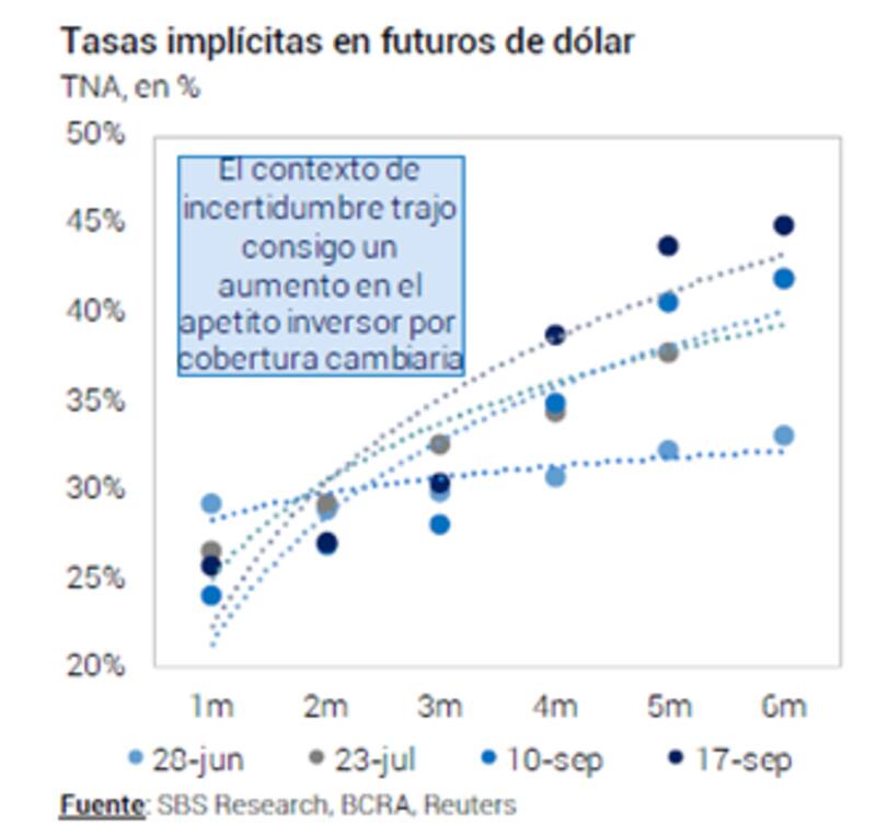 Esto mismo alertaron los analistas de Grupo SBS en su informe semanal en el que remarcaron que "el contexto de incertidumbre trajo consigo un aumento en el apetito inversor por cobertura cambiaria".