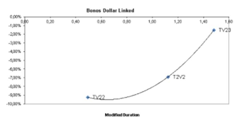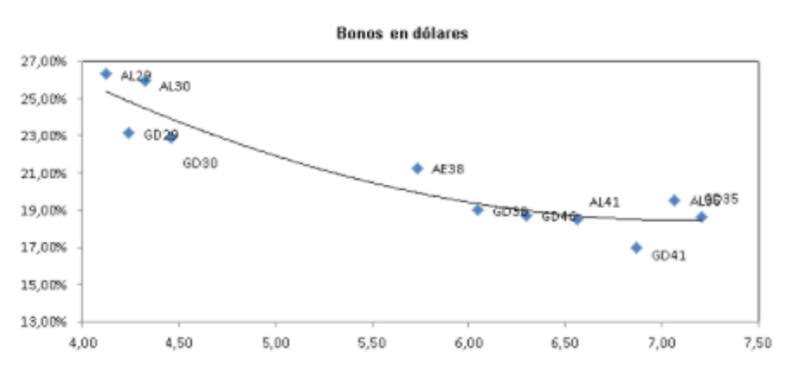 El bono dólar linked no deja de ser un instrumento en dólares, por lo que se debe comparar con la deuda en dicha moneda. Actualmente, los bonos en moneda dura rinden, en su tramo más corto, cerca del 27% y 19% en el extremo más largo.