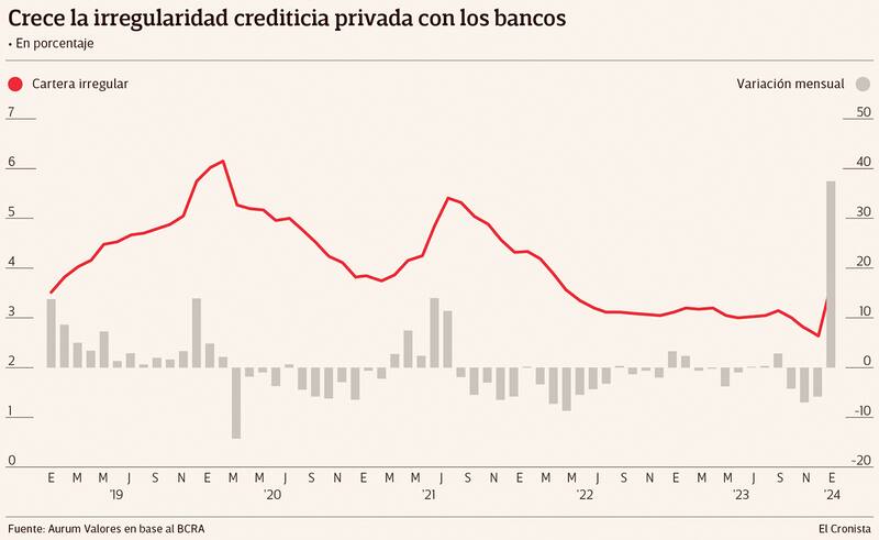 Los datos que exhibe la autoridad monetaria en su último Informe sobre Bancos indican que al cierre de 2023 el ratio de irregularidad del crédito al sector privado ascendió hasta 3,7%, lo que implicó el repunte mensual más importante desde 2010, cuando empezó a elaborarse este indicador.