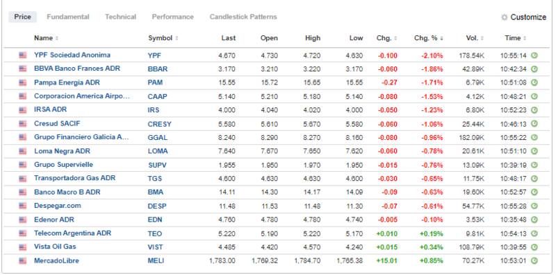 Las acciones argentinas en Wall Street tambien operan con perdidas, alineadas con la baja evidenciada en la renta variable global. Las debilidades son lideradas por YPF que retrocede 2,1%, BBVA Argentina pierde 1,8% y Pampa Energía cae 1,7%. El sector financiero cae 1% mientras que Mercadolibre sube 0,85% y junto con Vista y Telecom son las únicas acciones que operan el miércoles con ganancias.