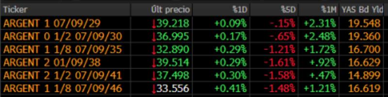 Los bonos fluctúan entre y se ven subas de hasta 0,3% como en el caso del Global 2041. Sin embargo, los bonos operan en toda la curva con paridades debajo del 40%, con tasas del 20% en el tramo mas corto y del 16% en el tramo largo.