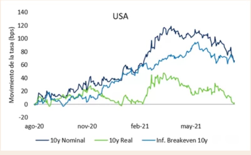 Juan Cruz Lekovic, fund manager de la gestora global Schroders, afirmó que la compresión de tasas de los bonos del Tesoro norteamericano de las últimas semanas se explica casi 100% por el componente real de la tasa, mientras que la expectativa de inflación futura continúa anclada en el 2,3% anual.