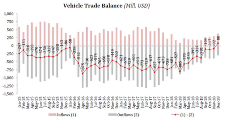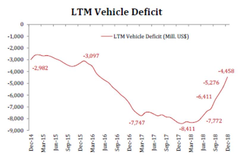 Un factor clave del déficit de la cuenta capital de Argentina es el déficit comercial de vehículos. En 2018, esta medida clave registró un pequeño superávit de u$s 80 millones. Esta recuperación ayudó a reducir el déficit de los últimos 12 meses y a cerrar el año en u$s 4,460. Es importante la comparación de final de diciembre contra el elevado valor registrado en febrero de 2018 de u$s 8,400 millones.