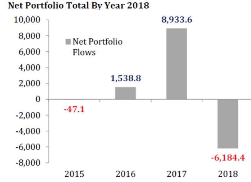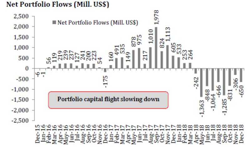 Dentro del análisis de los flujos de fondos, es notoria la saluda de capitales durante 2018. Según los datos presentados en el informe de Balanz, la salida de fondos en 2018 alcanzó los u$ 6184 millones marcando una reversión significativa respecto de los dos primeros años de la gestión de Macri.
