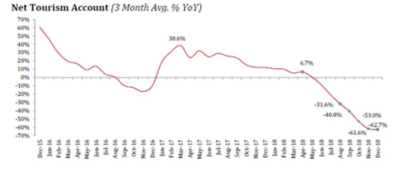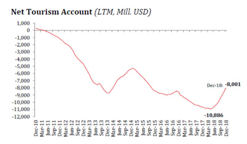 “El déficit de turismo en los últimos 12 meses se ha reducido a u4s 8,000 millones desde el nivel máximo de u$s 10,900 millones en abril de 2018. De esta manera marca una reducción del 26,7% , afirmaron desde Balanz.