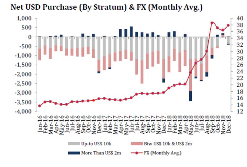 A la vez, en el reporte de la compañía relacionan dicha salida de dólares con la fuerte caída de los activos financieros durante diciembre. Los bonos cayeron con fuerza a la vez que el riesgo país subía por encima de los 800 puntos. Dicho esto, destacaron que “las personas tienden a vender en el peor momento y en ese sentido, es importante señalar que en enero hemos visto una recuperación saludable en los precios de los bonos. El riesgo país apuntó a la baja en los primeros días de 2019, cayendo en 145 puntos básicos, factor que puede quitar momentum a la demanda de dólares por parte de los participantes .